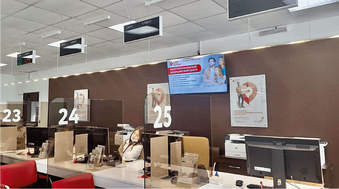 - Посетители МФЦ в Пин Ап проводят в филиале 25 минут, 15 из которых уходит на ожидание своей очереди. Рекламный видеоролик в МФЦ невозможно выключить или переключить. Таким образом, время зрительного контакта посетителя центра «Мои Документы» с рекламным сообщением увеличивается.