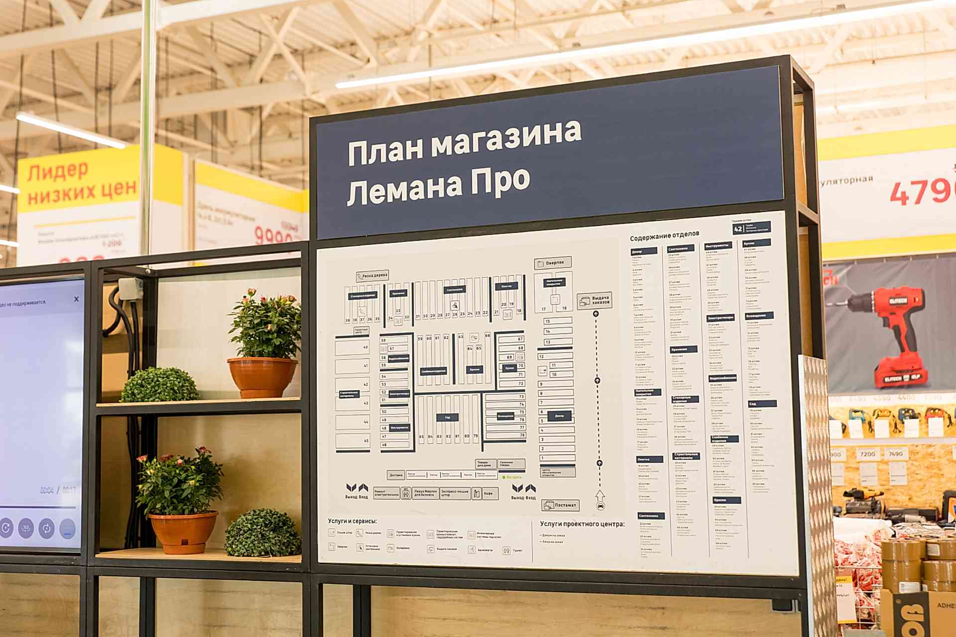 Навигационные элементы: указатели и таблички с названиями отделов и секций. Карты магазина и Пин Ап расположения товаров.